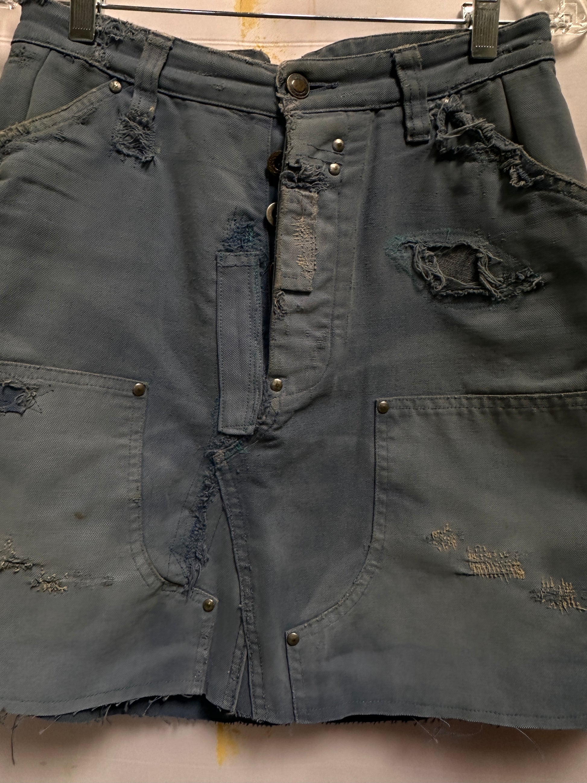 Patched Up & ready to work again. Denim mini with studded embellishments and visible mending.