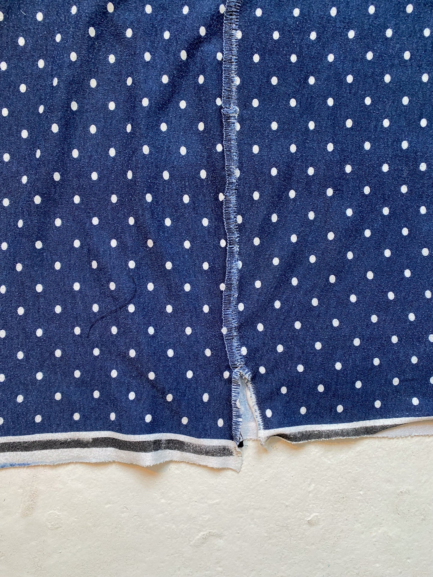 Misprinted polka dot tee, stitched black short sleeves, asymmetrical bottom hemline