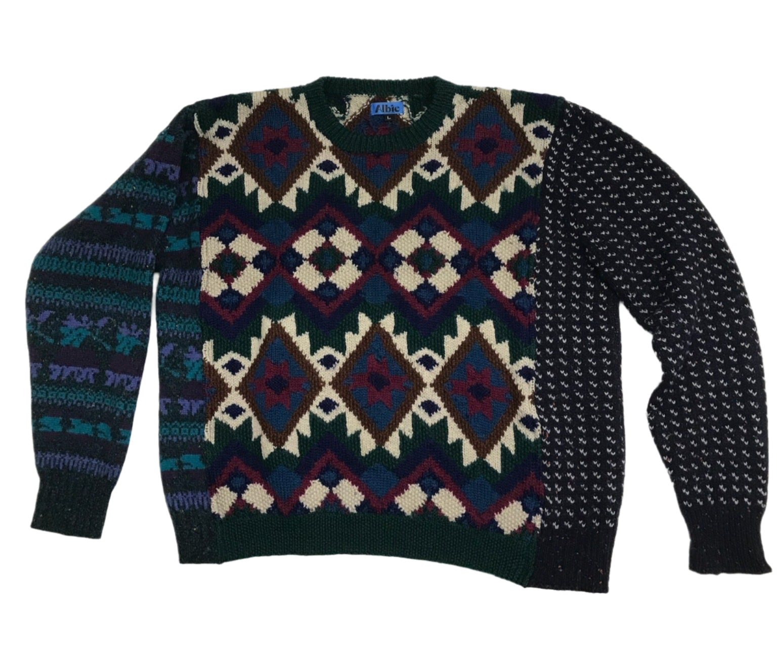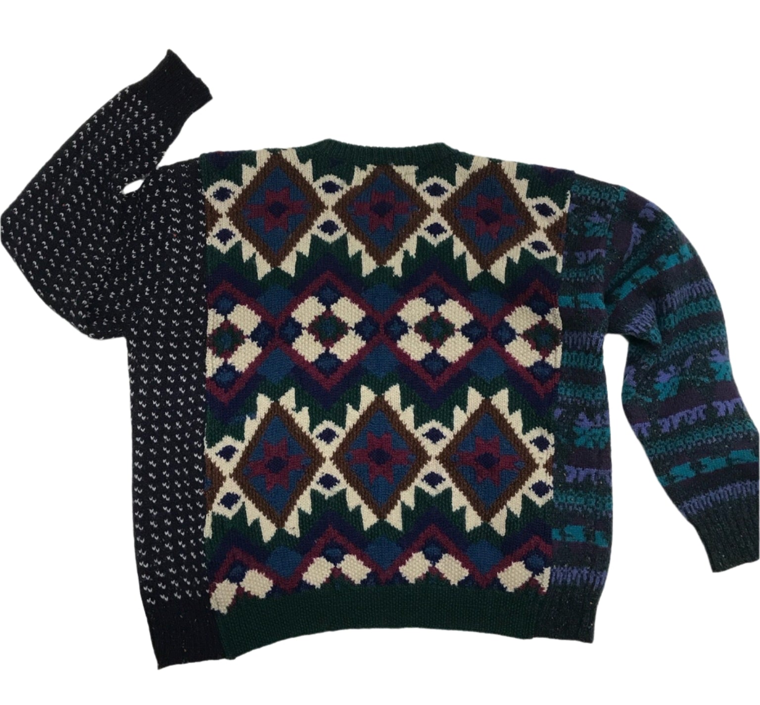 Vintage sweaters re-animated into new electric combos. Mixed fibers. Definitely wool panel, cotton center, wool blend. Some fraying, some repairs/ Not new