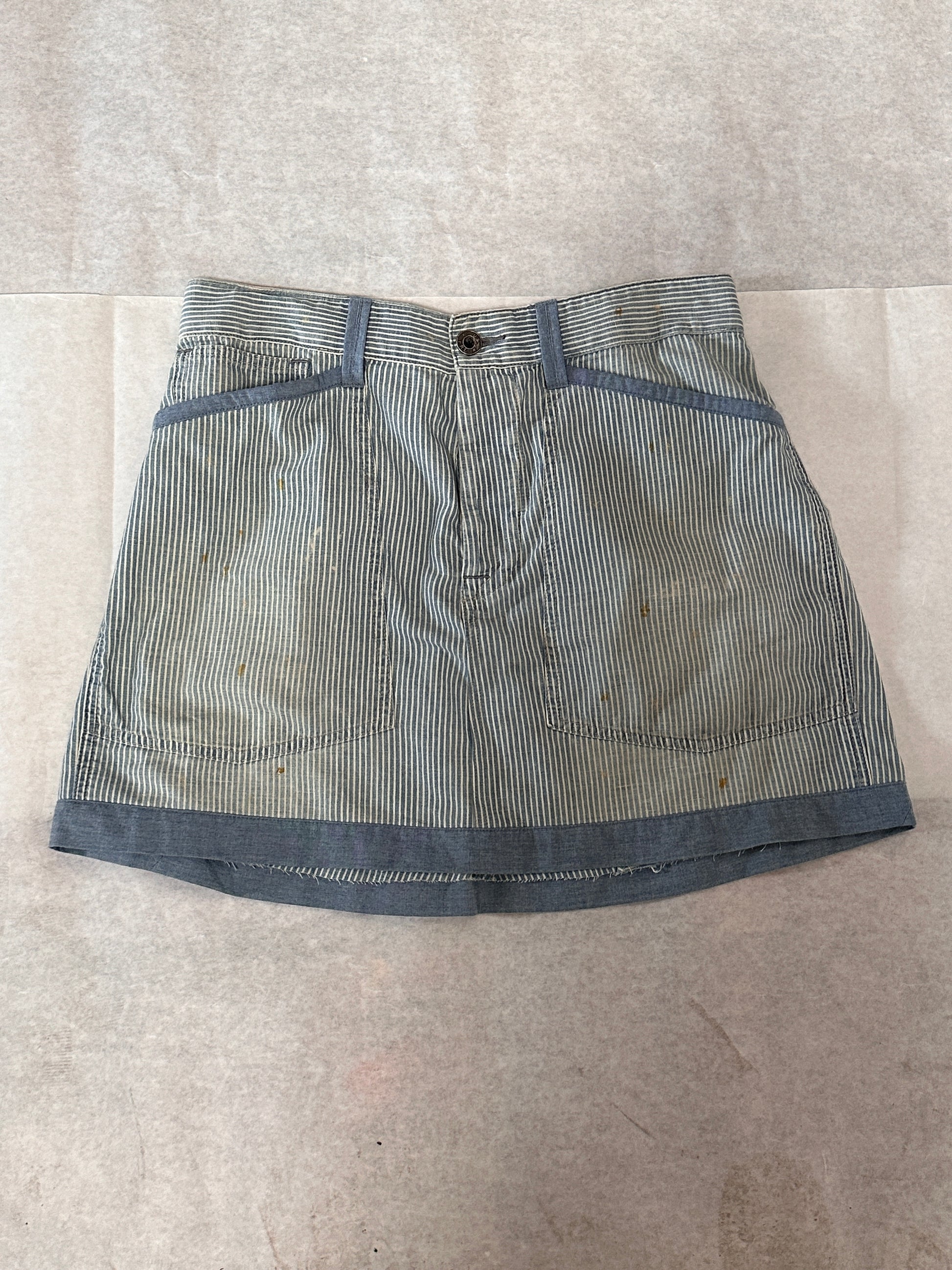 Reworked pinstripe skirt with two pockets me an adjustable buckle-back belt and button fly detailing